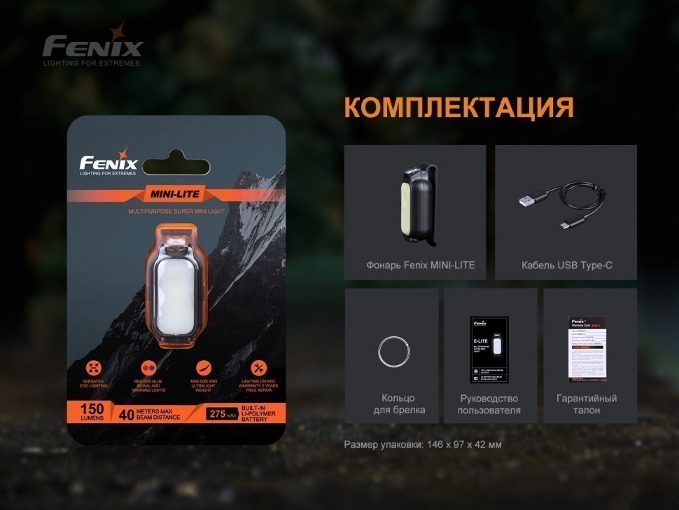 - комплектация — фонарь Fenix MINI-LITE, брелок для ключей, кабель USB Type-C, руководство пользователя, гарантийный талон