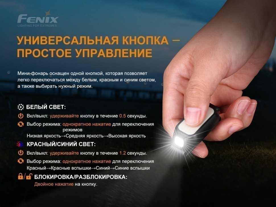 Для переключения режимов в EDC-фонаре предусмотрен всего один переключатель. Для включения белого света необходимо зажать кнопку на 0,5 секунд, для перехода в режим красного/синего света — на 1.2 секунды. Однократное короткое нажатие позволяет выбирать нужную яркость и режим свечения. Также в фонаре есть функция блокировки, которая предотвращает случайное включение и не позволяет прибору разрядится.