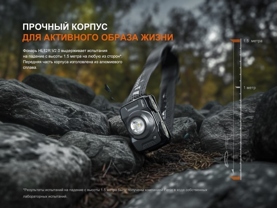 Аккумуляторный налобный фонарь обладает защитой от воды и пыли IP66. Это значение показывает, что устройство полностью защищено от попадания пыли внутрь корпуса и может использоваться во время дождя. Ударопрочность Fenix HL12R V2.0 составляет 1.5 метра. Передняя часть фонаря выполнена из прочного алюминиевого сплава.