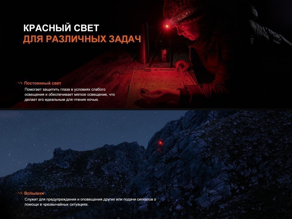В LED-фонаре установлены два светодиода — белый Luminus SST20 и красный 2835. Срок службы каждого из светодиодов составляет 50 000 часов. Фонарь обеспечивает максимальную яркость света в 500 люменов и дальнобойность луча до 125 метров. Благодаря четырем режимам белого и двум режимам красного света Fenix HL12R V2.0 обеспечивает универсальное освещение для самых различных ситуаций. Белый свет не позволит вам заблудиться в темноте, а красный защитит зрение во время чтения ночью. Также красный свет не привлекает насекомых, что особенно удобно при отдыхе на природе.