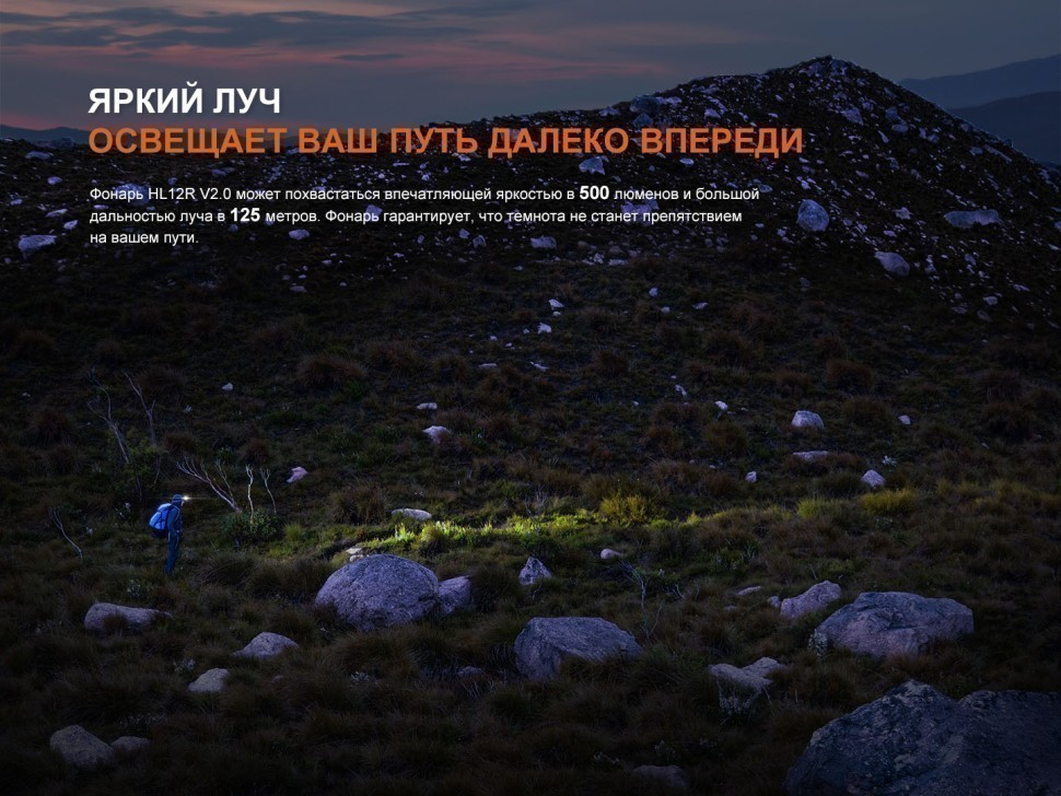 В LED-фонаре установлены два светодиода — белый Luminus SST20 и красный 2835. Срок службы каждого из светодиодов составляет 50 000 часов. Фонарь обеспечивает максимальную яркость света в 500 люменов и дальнобойность луча до 125 метров. Благодаря четырем режимам белого и двум режимам красного света Fenix HL12R V2.0 обеспечивает универсальное освещение для самых различных ситуаций. Белый свет не позволит вам заблудиться в темноте, а красный защитит зрение во время чтения ночью. Также красный свет не привлекает насекомых, что особенно удобно при отдыхе на природе.