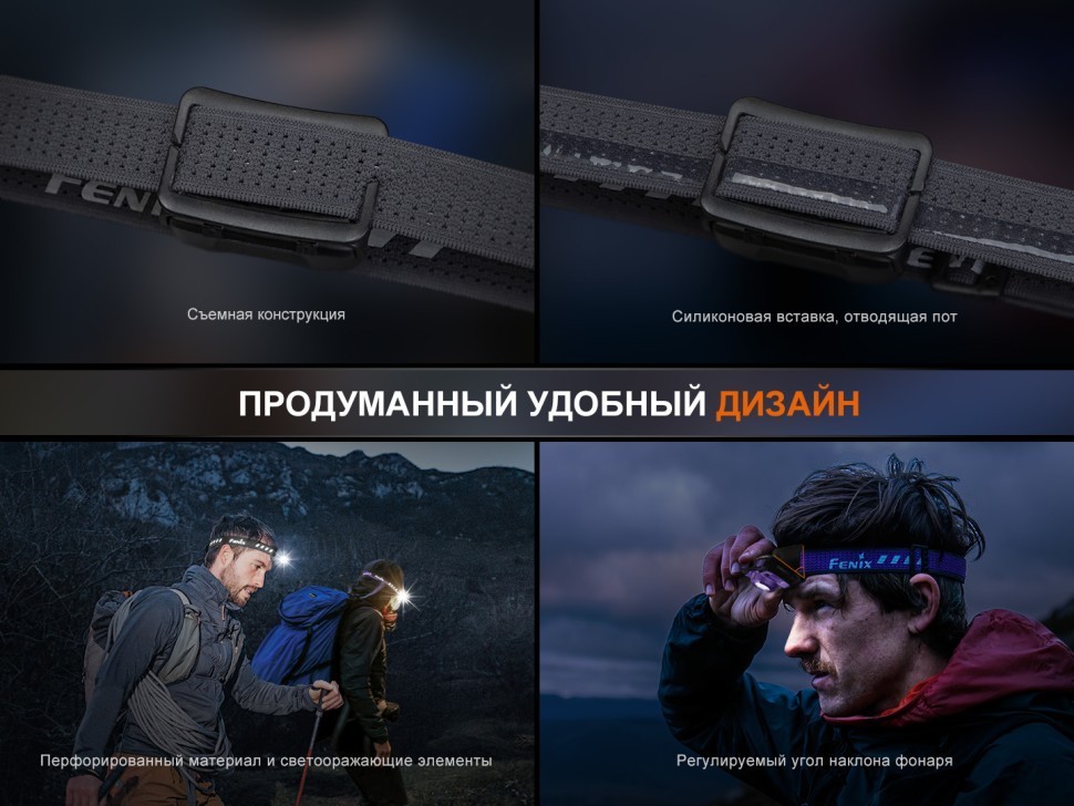 Компактный фонарь и оголовье выполнены в универсальном сером цвете, который подойдет к любой экипировке. Перфорированное оголовье отлично пропускает воздух, позволяя коже дышать. Силиконовая полоса во внутренней части ремешка надежно фиксирует фонарь на голове, не давая ему соскользнуть. А также отводит пот, чтобы он не заливал глаза во время интенсивных нагрузок. Светоотражающие вставки на оголовье обеспечивают безопасность при движении в темное время суток.