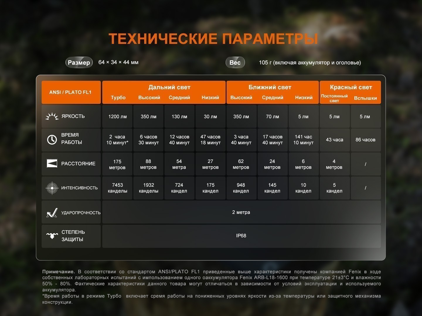 - Турбо — 1200 лм — 175 м — 2 часа 10 минут — 7453 кд;