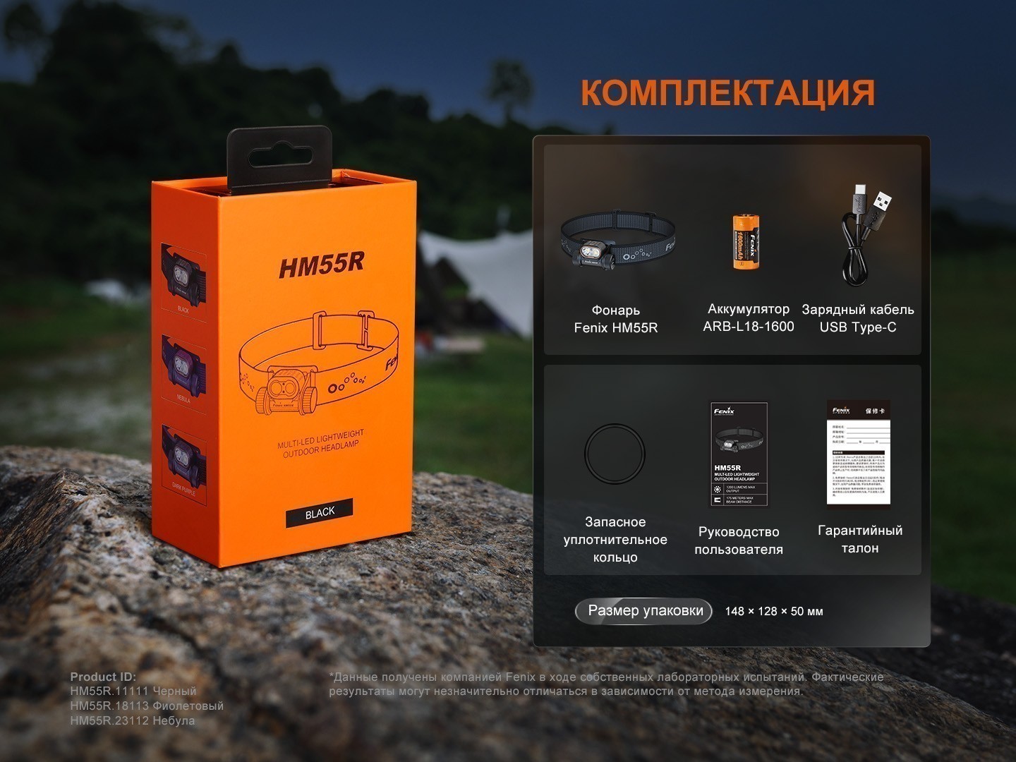 - комплектация — фонарь Fenix HM55R, аккумулятор ARB-L18-1600 (формат 18350), кабель Type-C, запасное уплотнительное кольцо, руководство пользователя, гарантийный талон;