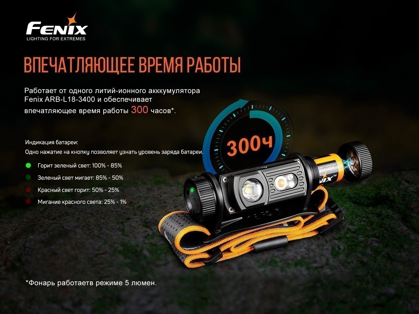 * Все приведенные показатели работы налобника получены в ходе его проверки в лаборатории. Где были следующие условия: применялся аккумулятор Fenix ARB-L18-3400 Li-ion при температуре 21±3°C и влажности 50%-80%. Фактические параметры свечения могут отличаться в зависимости от используемых элементов питания и условий окружающей среды. Длительность работы в Турбо режиме указана суммарно, учитывая понижение режима при срабатывании защиты от перегрева.