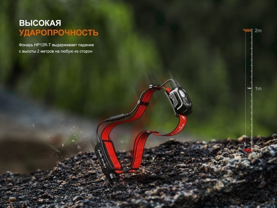 Fenix HP12R‑T обладает степенью защиты IP66 — он устойчив к пыли, сильным дождям и механическим нагрузкам. Конструкция выдерживает активное использование в жестких условиях, включая падение с высоты 2 метра. Вес фонаря вместе с аккумулятором составляет 199 г, размеры головного блока — 61×37×28 мм, аккумуляторного — 92×35×36 мм. Перфорированное оголовье со светоотражающими вставками обеспечивает комфорт при ношении и безопасность в темное время суток.