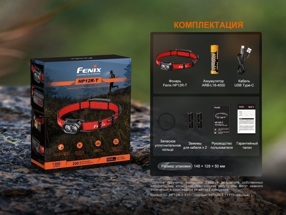- комплектация — фонарь Fenix HP12R-T, аккумулятор Fenix ARB-L18-4000, кабель Type-C, запасное уплотнительное кольцо, зажимы для кабеля х2, руководство пользователя, гарантийный талон;