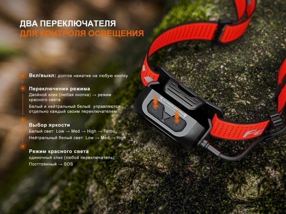 Управление налобным фонарем простое и интуитивное, с возможностью быстрого переключения между режимами. Две отдельные кнопки отвечают за белый и нейтральный белый свет. Чтобы переключиться в режим красного света необходимо дважды нажать на любую из кнопок.