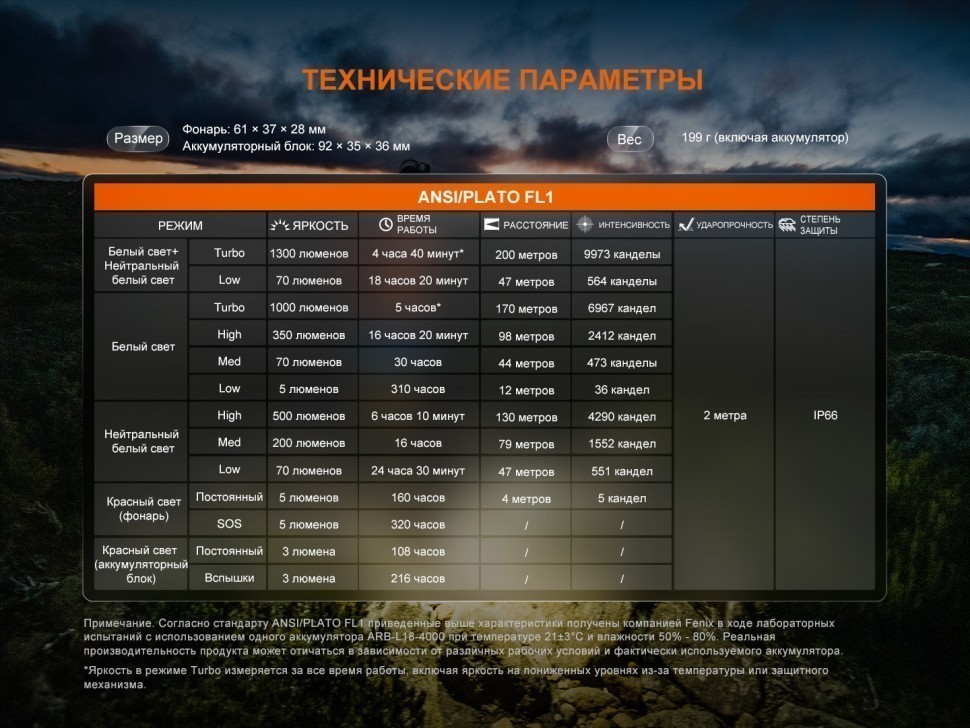 | Размеры | 61× 37× 28 мм (фонарь), 92× 35× 36 мм (аккумуляторный блок) | ||||||||||||||