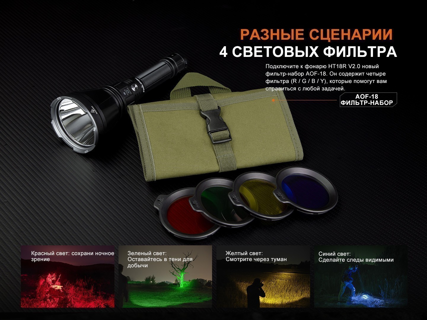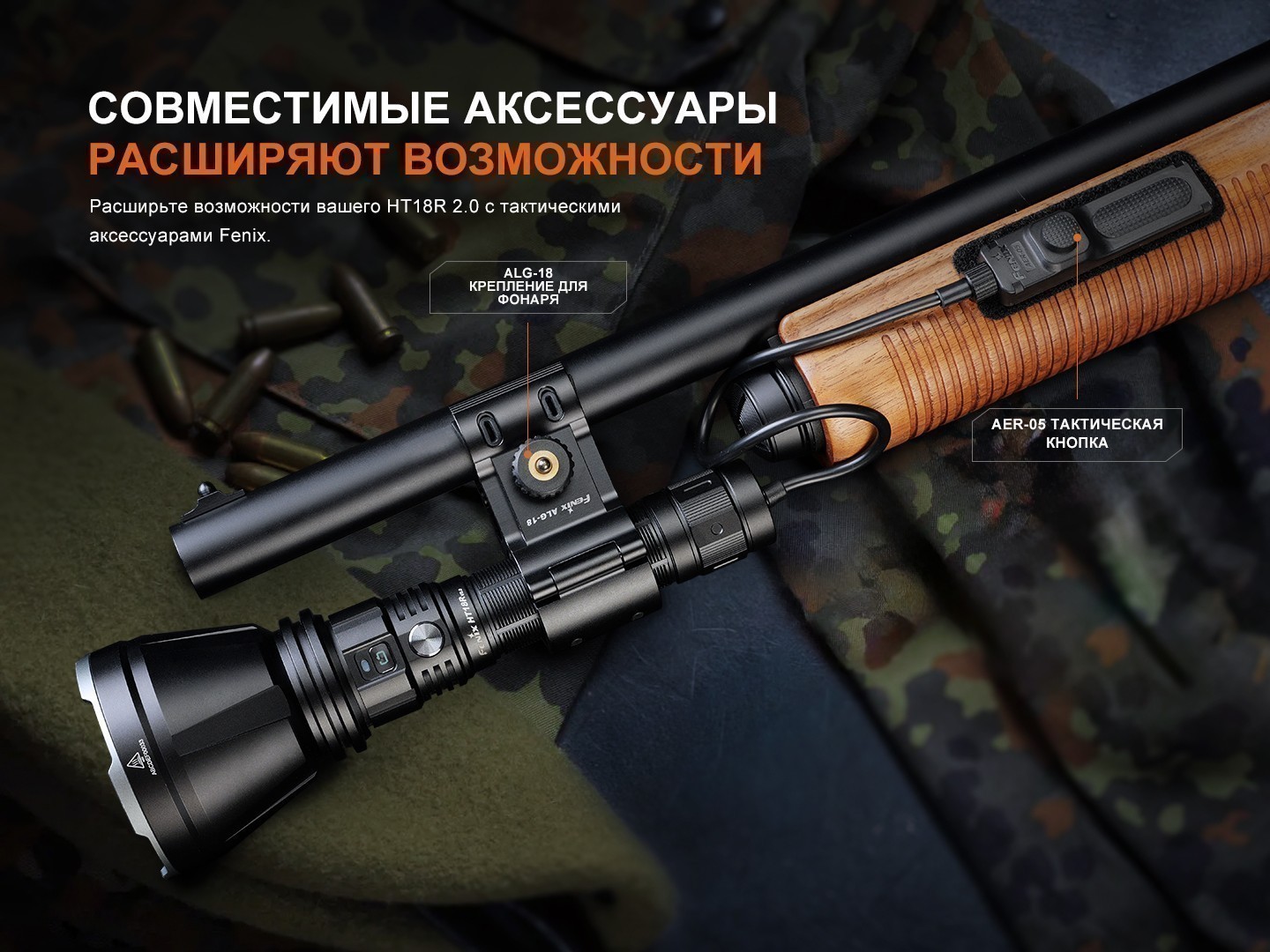Фонарь совместим со светофильтрами AOF18 разных цветов — красный, синий, желтый и зелёный, которые позволяют адаптировать свет под разную обстановку, при охоте, тумане, и т.д. Также предусмотрены крепление на оружие ALG-18 (если используется как подствольный фонарь), выносная кнопка AER-05 — всё, чтобы Fenix HT18R V2.0 мог выступать как подствольный фонарь, охотничий фонарь и тактический фонарь одновременно.