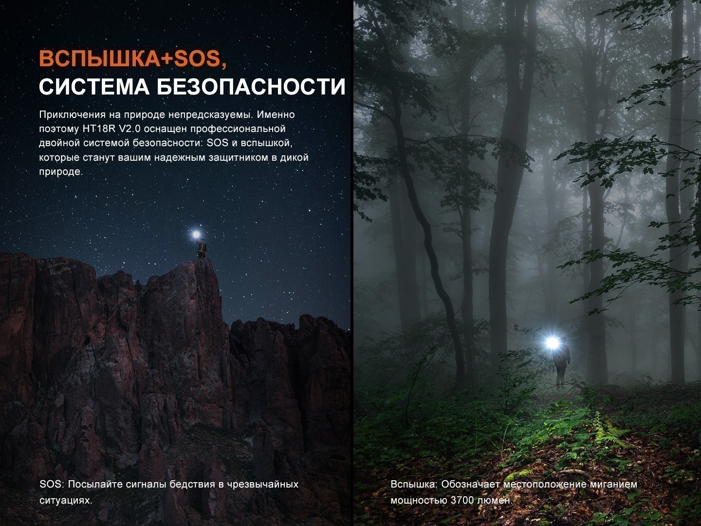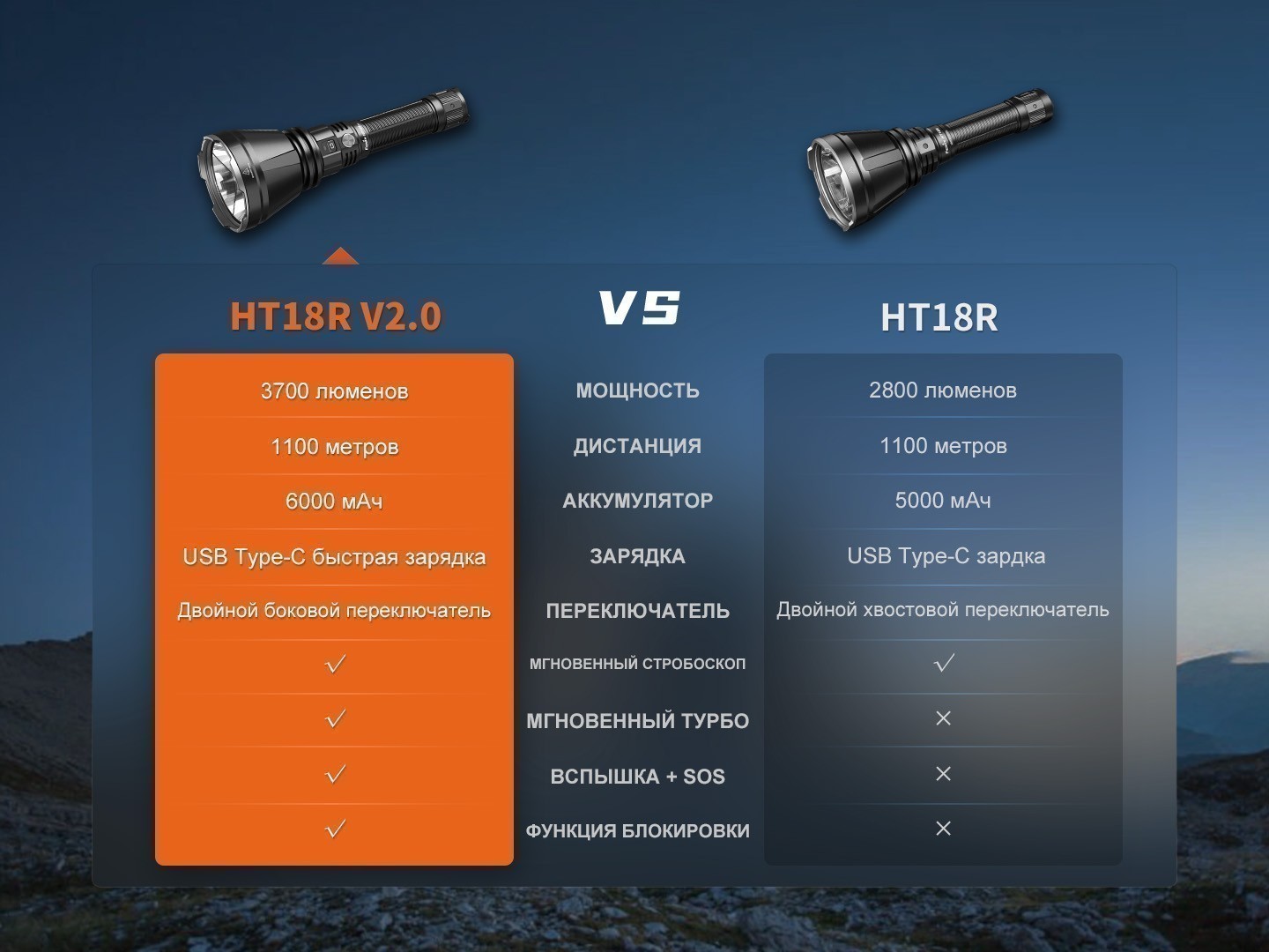 Вторая версия HT18R стала заметным шагом вперёд: фонарь Fenix HT18R V2.0 сочетает в себе возможности охотничьего и поисково-спасательного фонарей, объединяя большую мощность, современную оптику и удобное управление. Ключевой особенностью модели стала очень высокая яркость в 3700 люмен и дальность освещения до 1100 метров, что сразу выводит его в категорию профессиональных решений.