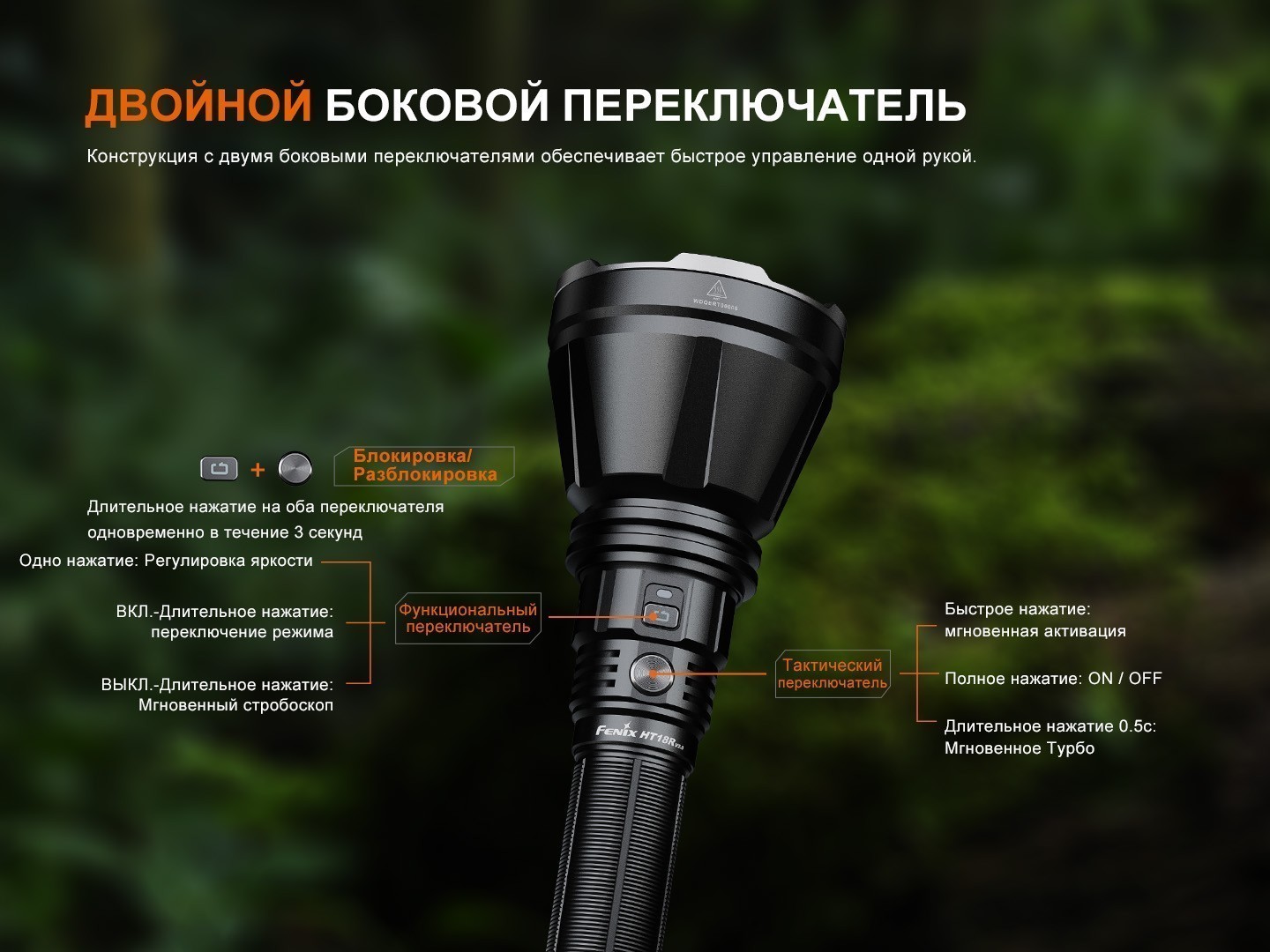 Управление у HT18R V2.0 реализовано через двойную систему: тактическая кнопка — для мгновенного включения (в том числе турбо-режима), и функциональная кнопка — для переключения режимов светового потока и активации специальных режимов (мигающий, SOS).