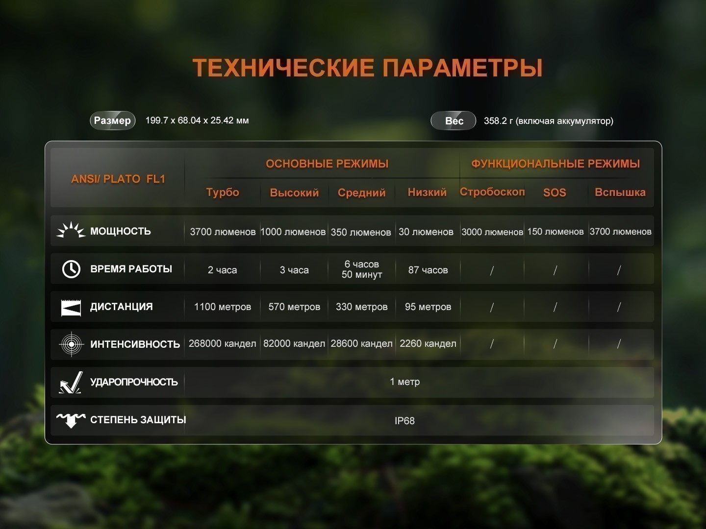 - Турбо — 3700 лм — 1100 м — 2 ч — 268 000 кд;