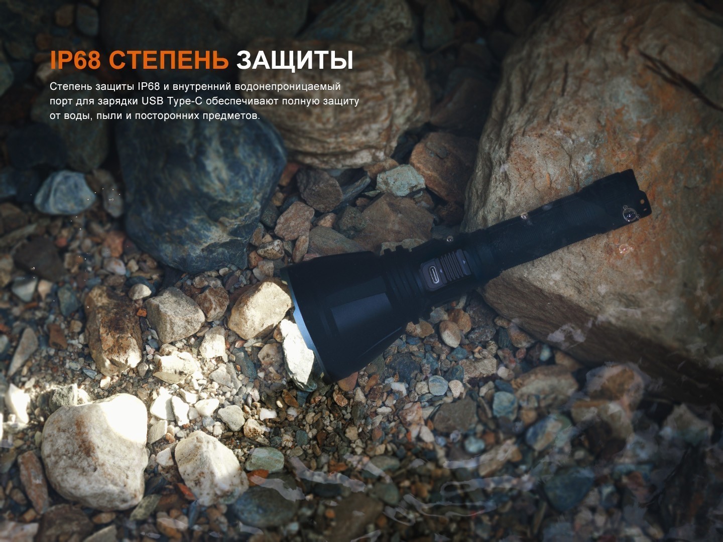 Fenix HT18R V2.0 имеет степень защиты IP68, что означает водонепроницаемость и защиту от пыли — такой фонарь можно смело использовать в дождь, грязь или пыльный воздух. Корпус из анодированного алюминия добавляет ударопрочности и долговечности, что важно для тактического фонаря, рассчитанного на суровые условия.