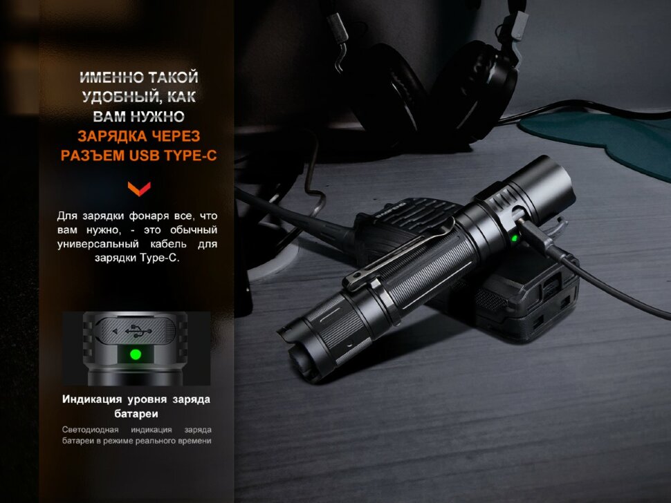 За автономность работы фонаря отвечает один Li-ion аккумулятор форм-фактора 18650 — фирменный элемент питания от компании Fenix, Fenix ARB-L18, емкость которого составляет 3400 мАч. При полном заряде аккумулятора устройство может работать до 100 часов, после чего рабочее напряжение падает ниже допустимой нормы, составляющей от 2.85 В до 6 В. Для восполнения заряда элемента питания не нужно предварительно вынимать его из батарейного отсека — достаточно использовать зарядный USB кабель, подсоединив его к порту Type-C, который находится в головной части корпуса. Зарядный процесс занимает 3 часа. После зарядки необходимо закрыть порт силиконовой заглушкой, чтобы предотвратить попадание внутрь капель воды, грязи и песчинок во время использования устройства.