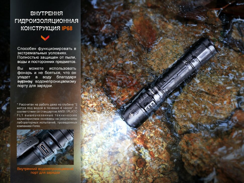 Защита от влаги и пыли соответствует классу IP68 за счет использования уплотнительного кольца, поэтому устройство не боится длительного контакта с влагой и сохраняет работоспособность даже при погружении в воду на глубину до нескольких метров. Для сохранения уровня герметичности корпуса на первоначальном уровне необходимо регулярно ухаживать за устройством и следить за состоянием уплотнительного кольца. В случае его деформации или появления на поверхности микротрещин, рекомендуется заменить уплотнительное кольцо на новое, которое входит в базовый комплект с фонарем.