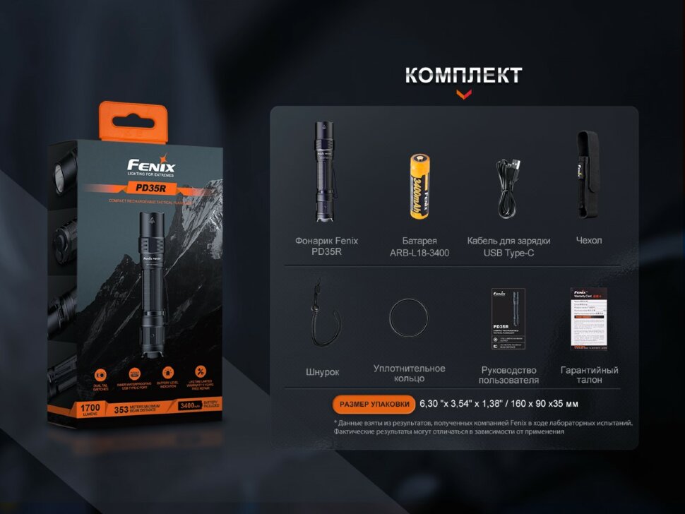 Fenix PD35R размером 136 х 25.4 х 23.2 миллиметра целиком помещается в ладони и имеет вес всего 140 грамм с учетом фирменного аккумулятора. Для расширения функциональности модели допускается применение вспомогательных аксессуаров: подствольных креплений ALG-00, ALG-15 и ALG-16, выносной кнопки AER-02 V2.0, сигнального жезла AOT-S+, диффузионного фильтра AOD-S V2.0 и цветных светофильтров AOF-S+, изменяющих цвет освещения.