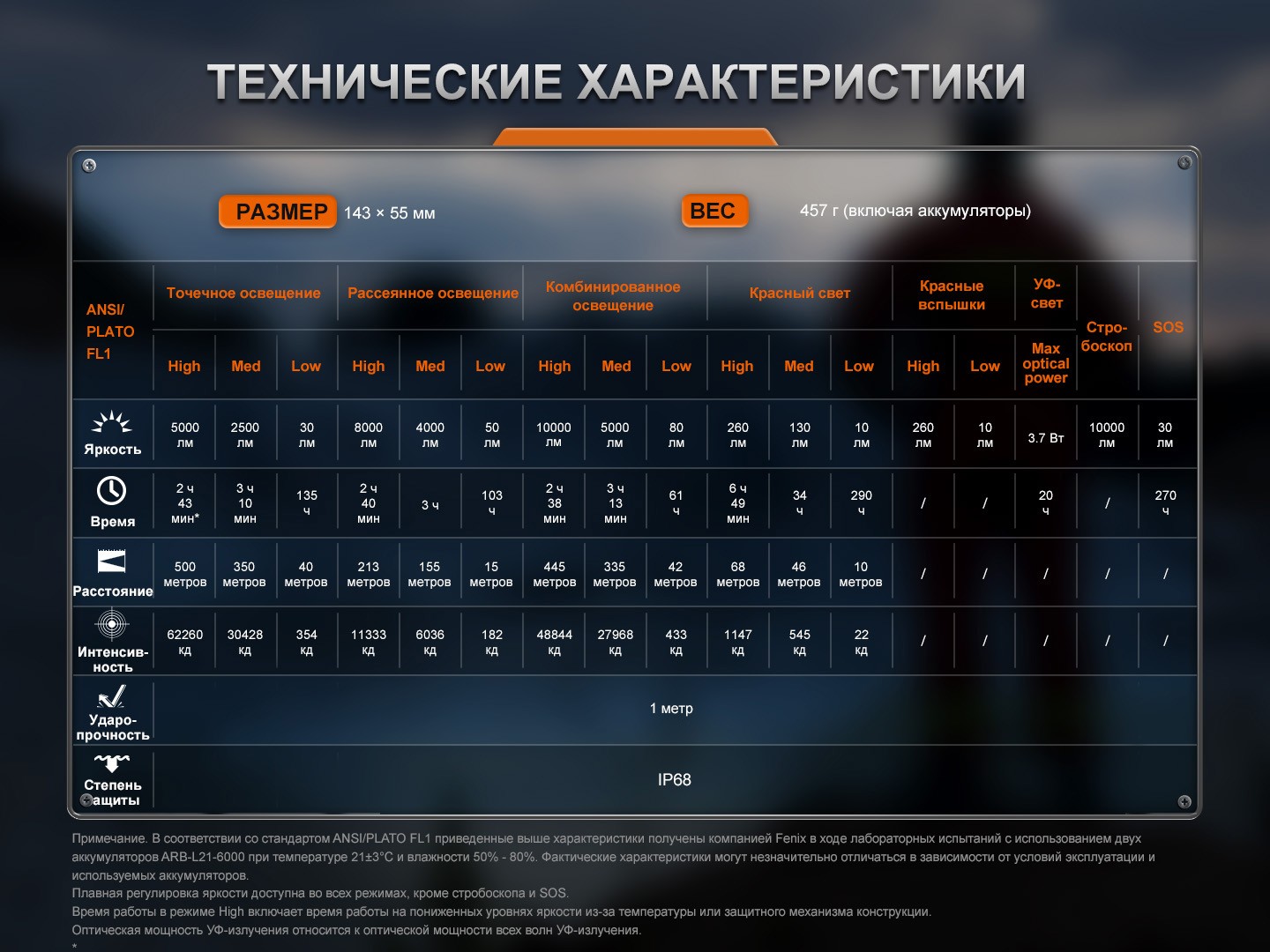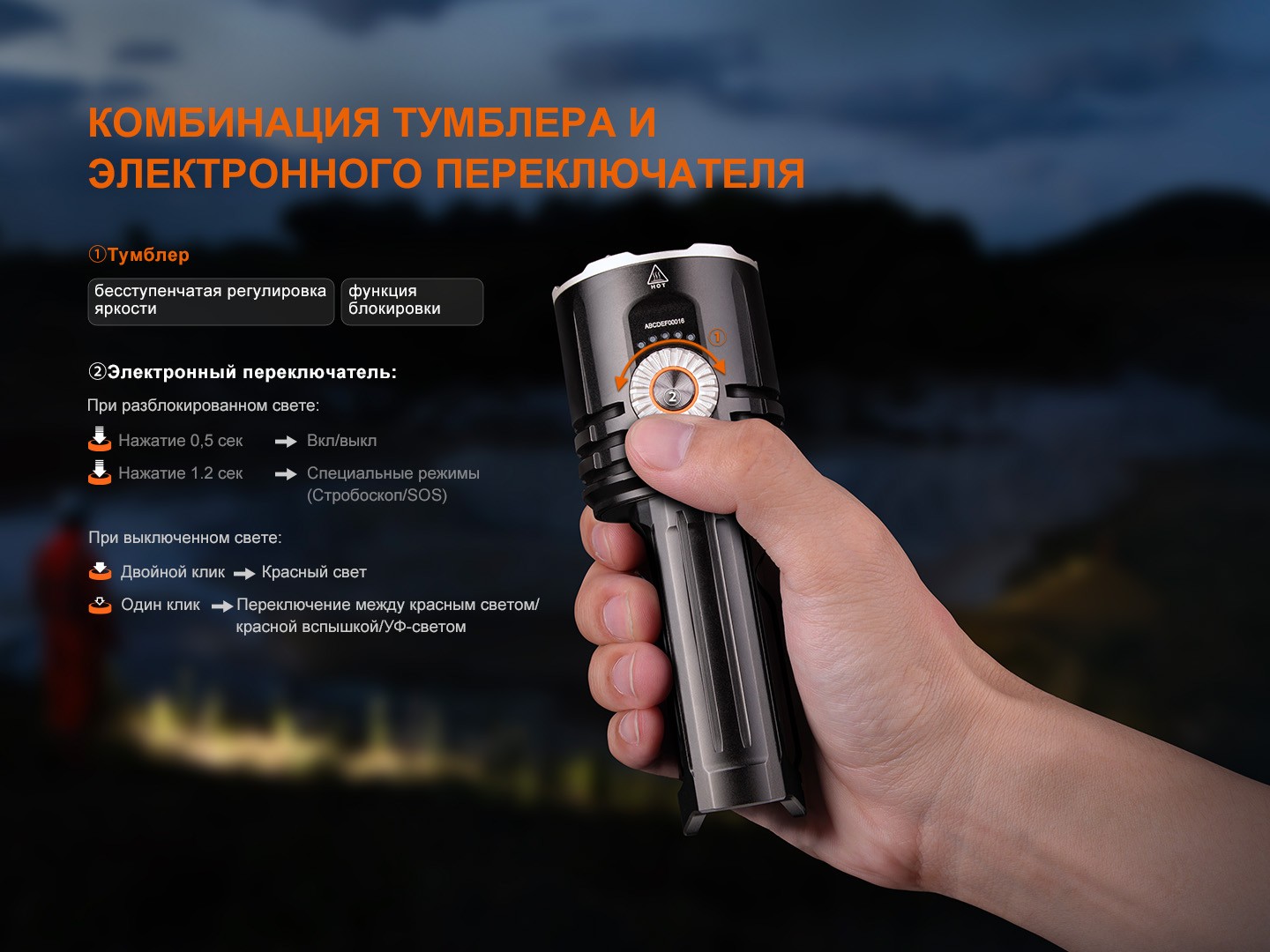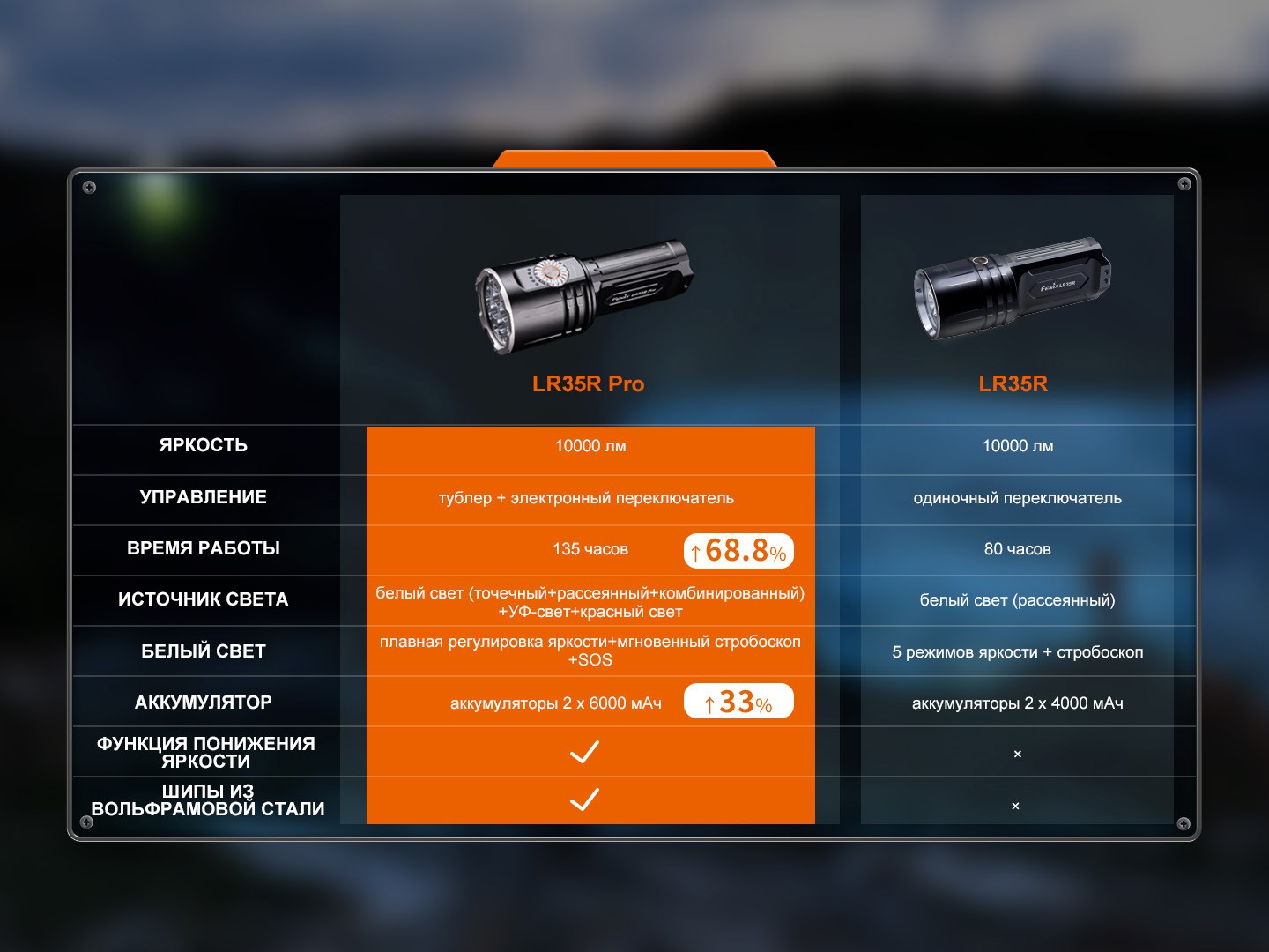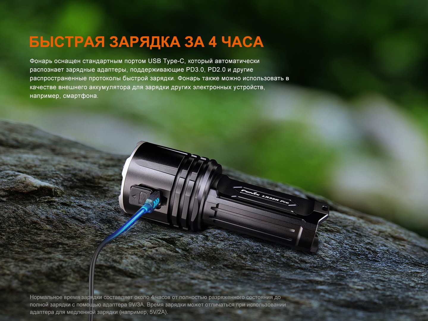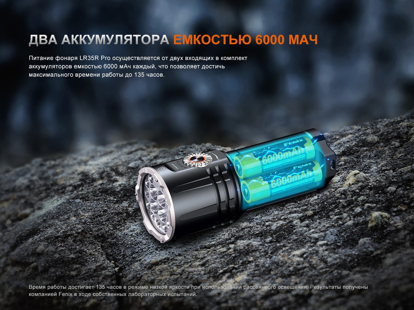 - комплектация — фонарь LR35R Pro, 2 аккумулятора Fenix ARB-L21-6000, кабель Type-C, запасное уплотнительное кольцо, чехол, руководство пользователя, гарантийный талон;