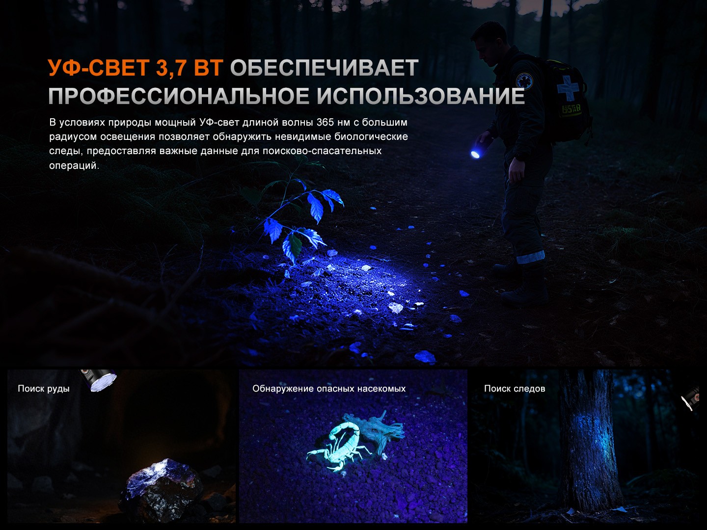 Главное достоинство LR35R Pro — яркость до 10 000 люмен и дальнобойность луча до 500 метров. Фонарь оснащен сразу несколькими типами светодиодов Luminus и OSRAM с ресурсом 50 000 часов, благодаря чему вы получаете три полноценных режима освещения: точечный для дальнего света, рассеянный для широкого охвата и комбинированный для максимального результата. Дополнительно доступны красный свет и вспышки для сохранения ночного зрения, ультрафиолет для проверки меток и документов, а также сигнальные режимы SOS и стробоскоп для экстренных ситуаций.