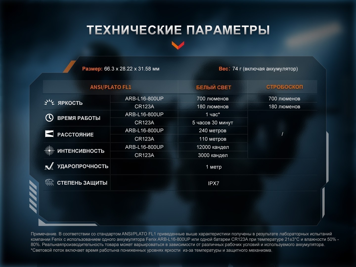 | Элементы питания | ARB-L16-800UP или CR123A | |||||||||||||