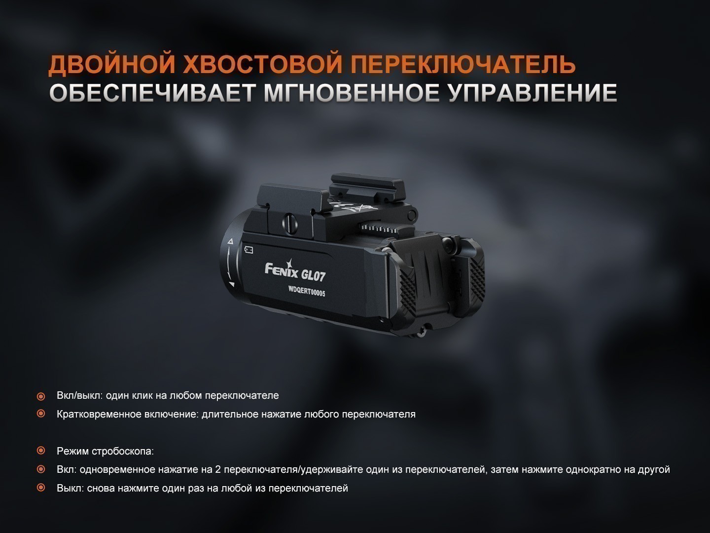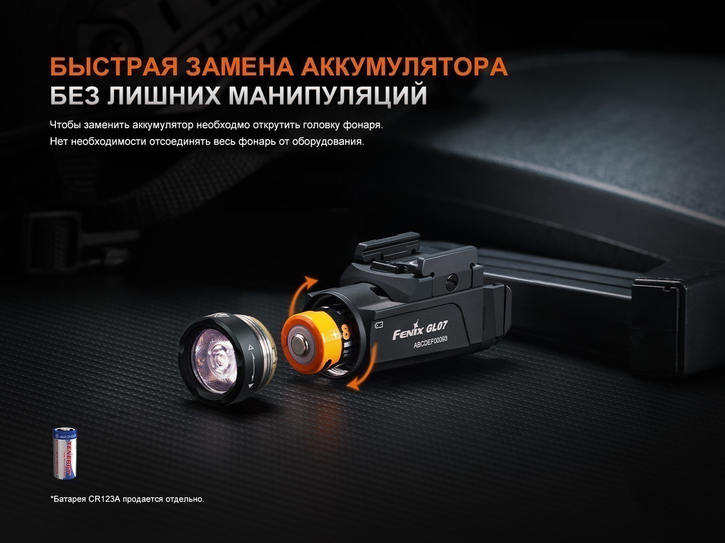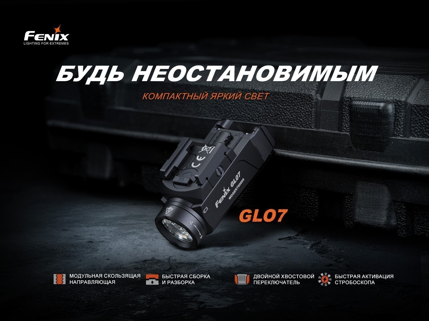 Fenix GL07 — это компактный подствольный тактический фонарь света с яркостью до 700 люмен, предназначенный для тактических и военных операций. Тактический фонарь оборудован быстросъемной модульной конструкцией для быстрого крепления и снятия.