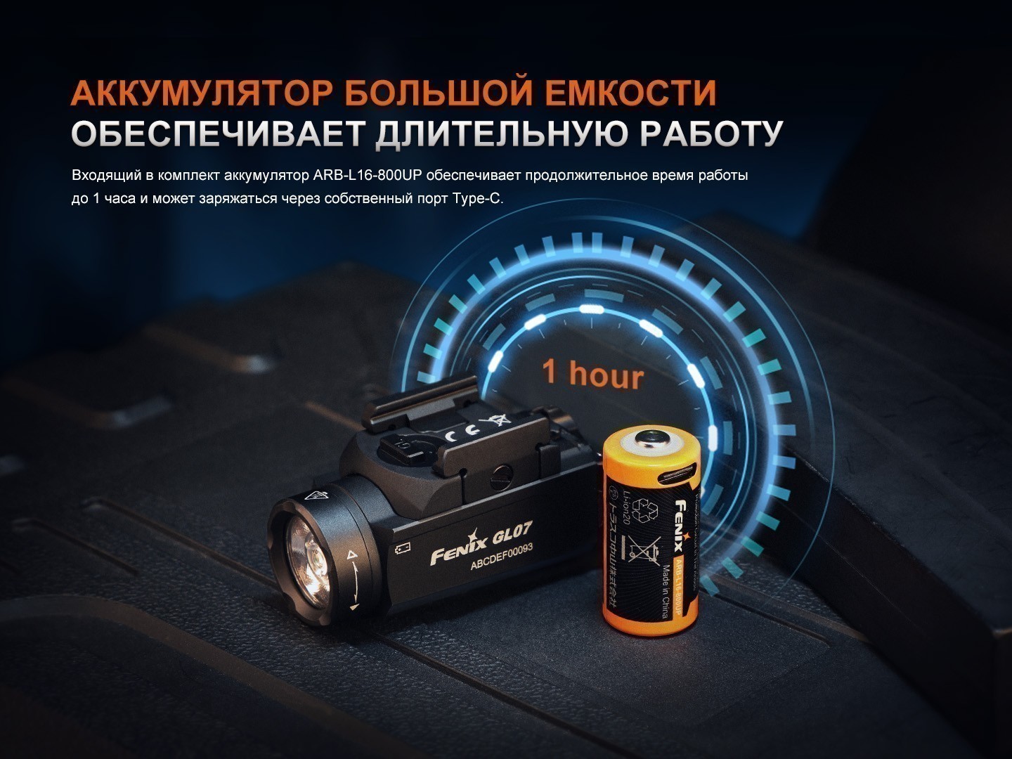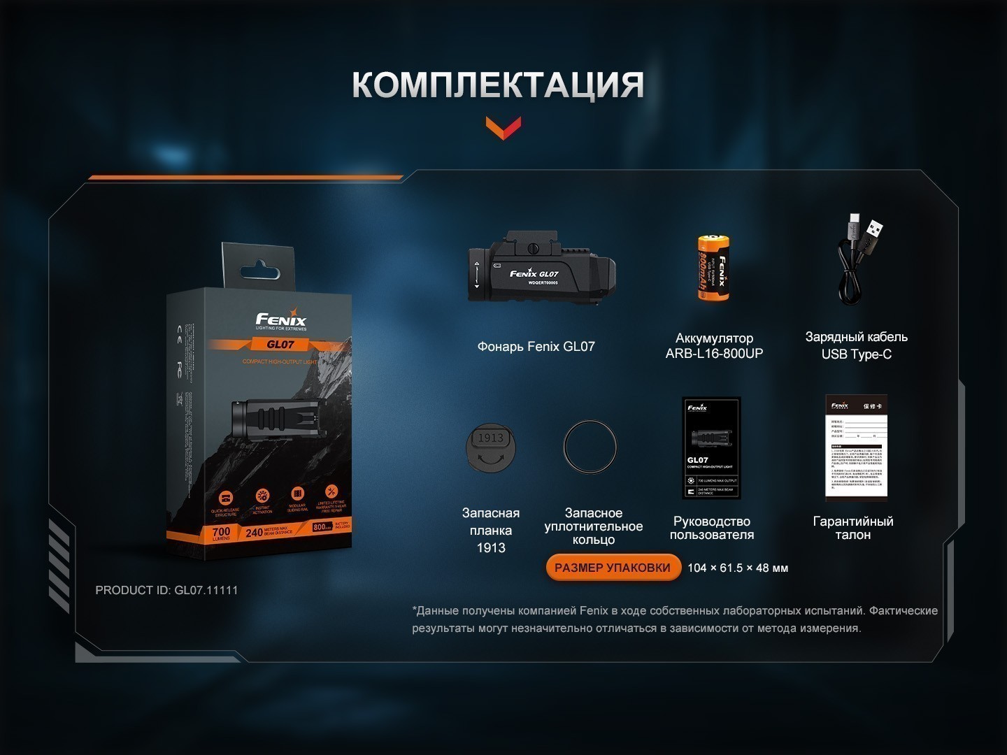 - комплектация — фонарь Fenix GL07, аккумулятор Fenix ARB-L16-800UP, кабель Type-C, запасное уплотнительное кольцо, запасная планка 1913, руководство пользователя, гарантийный талон;