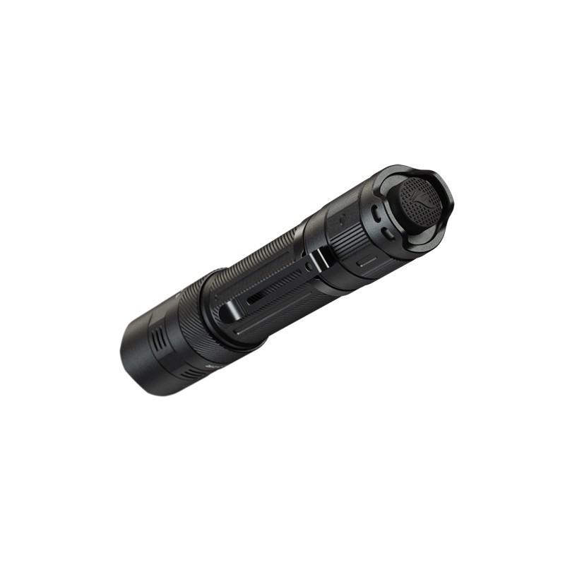 Фонарем можно управлять с помощью бесшумного переключателя в хвостовой части. Кнопка отвечает сразу за несколько функций: включение, выключение, режим стробоскопа и четыре уровня яркости. В комплекте с фонарем поставляется перезаряжаемый аккумулятор емкостью 3400 мАч, обеспечивающий до 70 часов работы. Также фонарь питается от двух морозостойких батареек CR123A. Благодаря чему фонарь подходит для применения в условиях низких температур и на большой высоте.