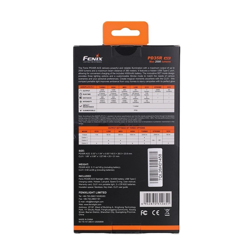 - комплектация — фонарь PD35R ACE , аккумулятор ARB-L18-4000, зарядный кабель USB Type-C, чехол, темляк, запасное уплотнительное кольцо, руководство пользователя, гарантийный талон, фонарь Fenix CL01, 2 батарейки CR1632, изоляционная прокладка, кольцо для брелка, шнурок для шеи, руководство пользователя;