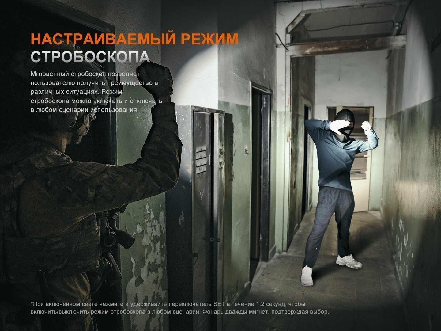 Тактический фонарь оснащен светодиодом Luminus SFT40 с максимальной яркостью до 2000 люмен и дальнобойностью луча до 380 метров, что делает его эффективным при поисковых работах, охране объектов или движении по пересеченной местности. Для управления предусмотрена тактическая кнопка для моментального включения и боковая кнопка для смены режимов и активации стробоскопа. Отдельный скрытый переключатель SET позволяет выбирать сценарии работы, активировать режим стробоскопа, что повышает удобство и безопасность использования. Всего в фонаре предусмотрено 3 сценария, каждый из которых объединяет от 1 до 7 режимов.