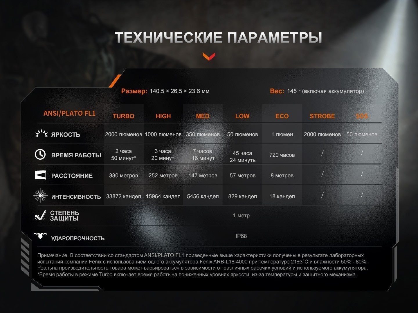 • вес тактического фонаря — 145 г (включая аккумулятор);