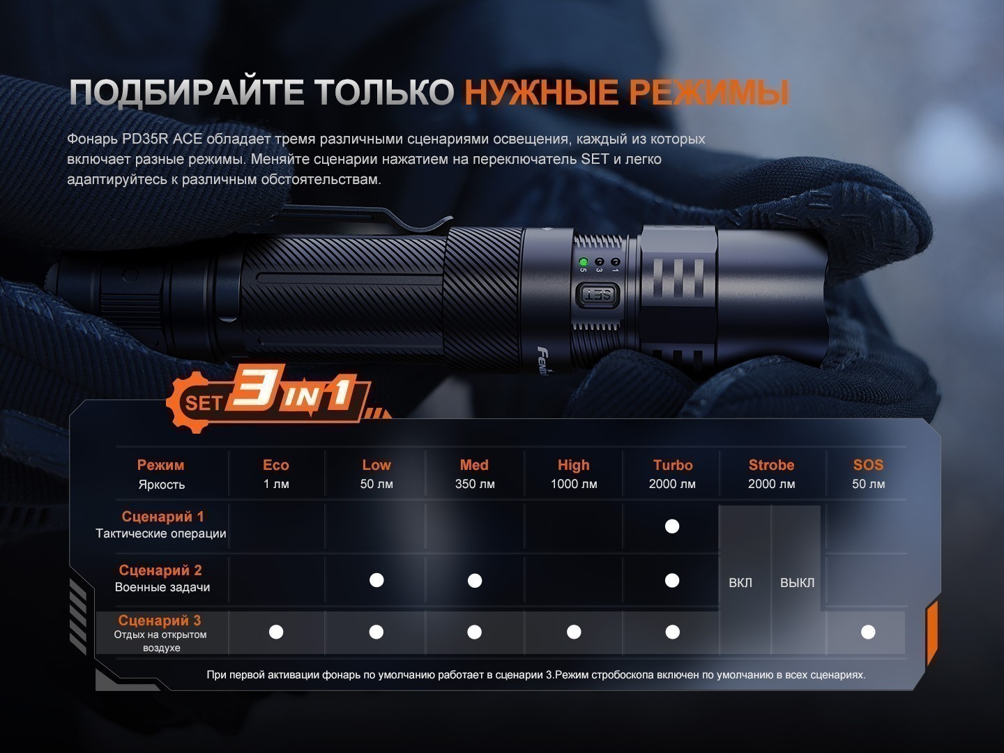 Fenix PD35R ACE — тактический светодиодный фонарь с инновационной системой управления SET. Она позволяет настраивать удобные сценарии и комбинировать режимы работы устройства под любые задачи.