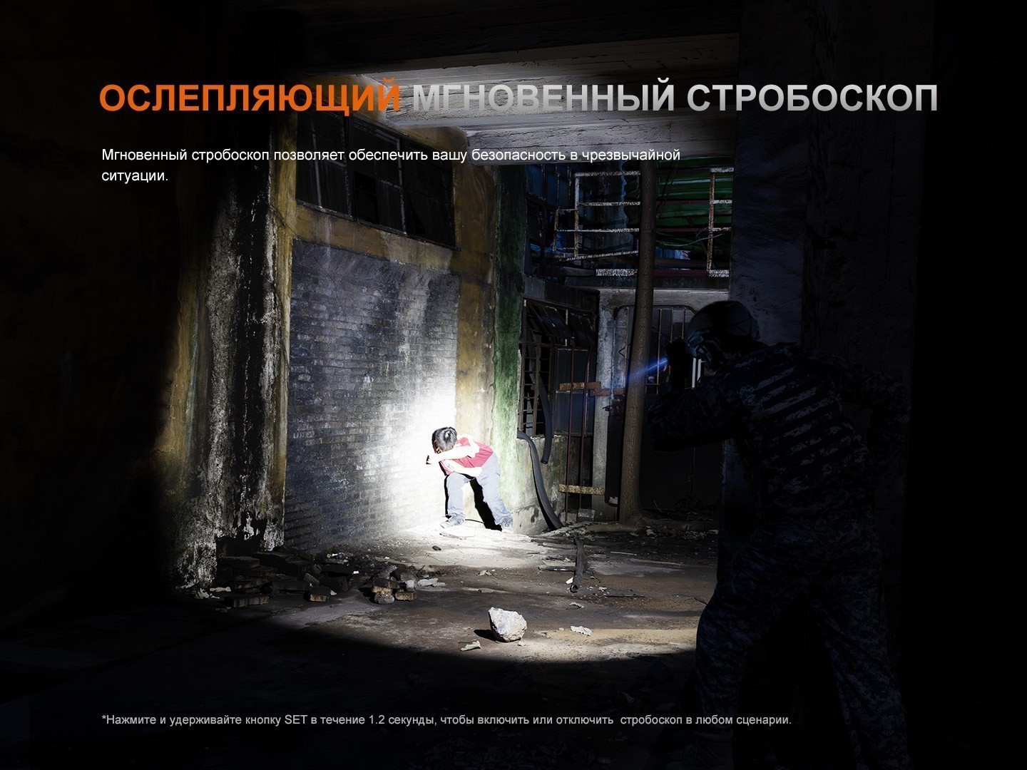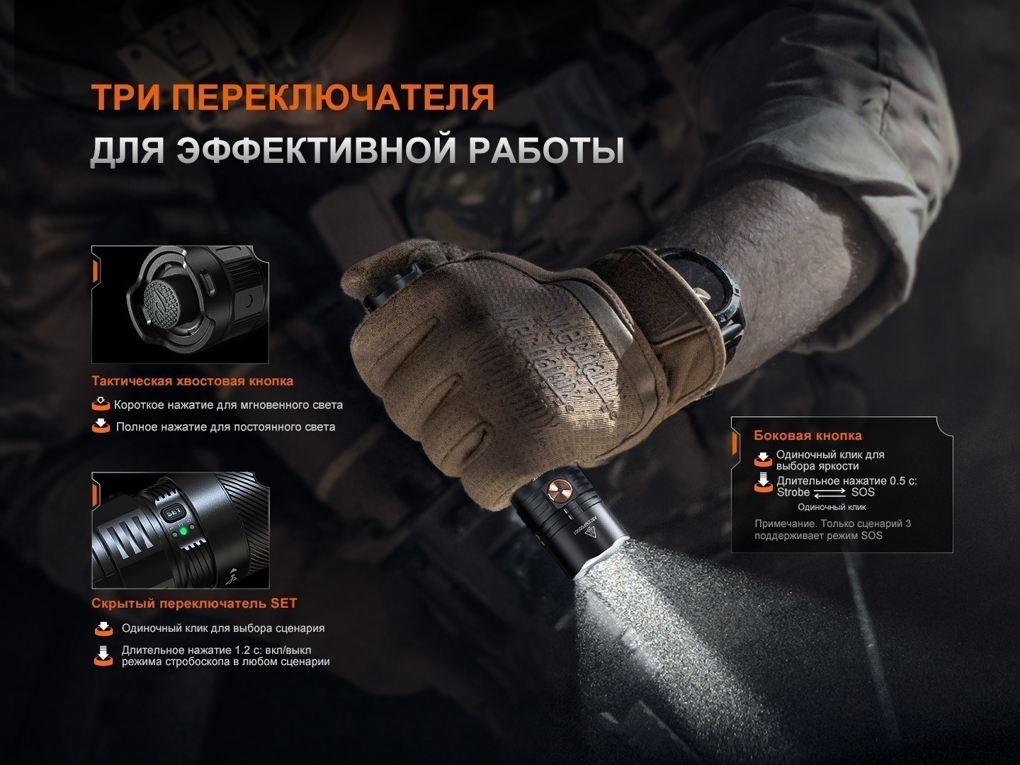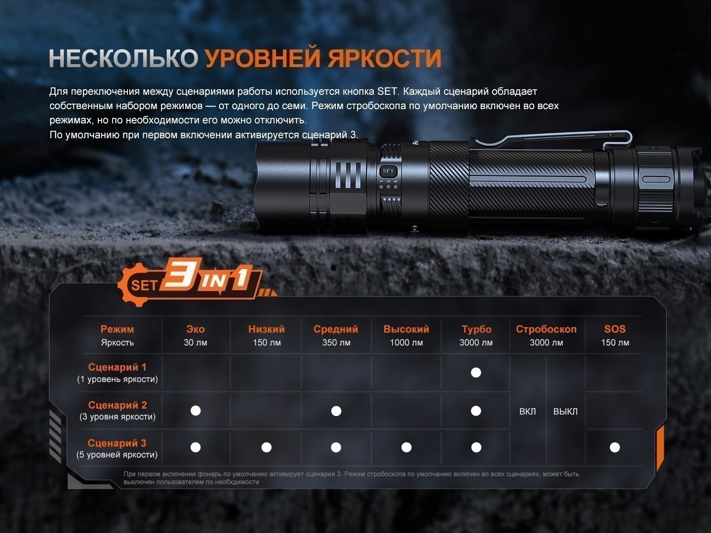 Главная особенность модели — режим SET, который позволяет пользователю выбрать один из трёх сценариев работы фонаря: