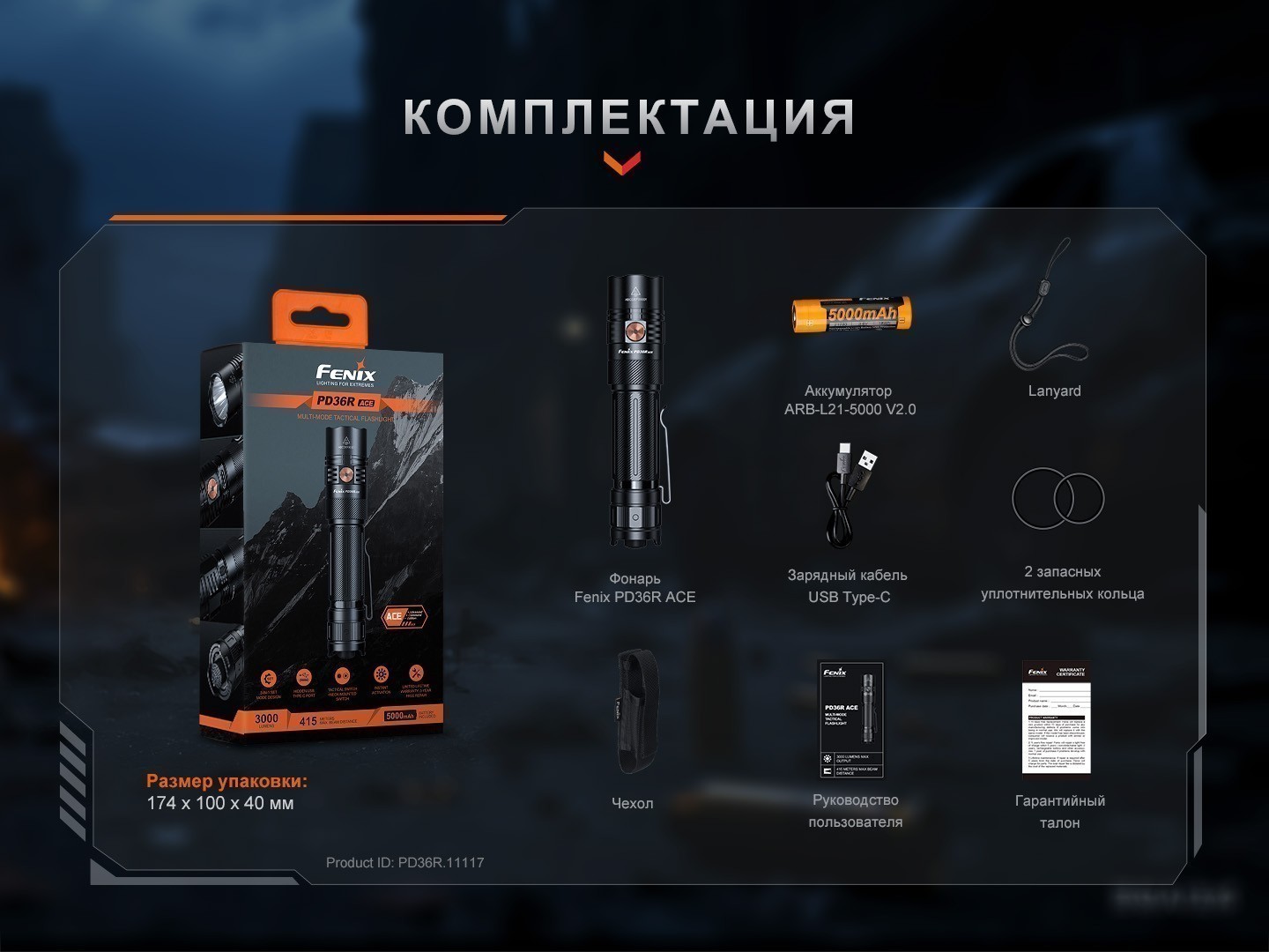 В комплект входят: фонарь PD36R ACE, аккумулятор ARB-L21-5000 V2.0, зарядный кабель USB-C, чехол, шнурок (lanyard), два запасных уплотнительных кольца.