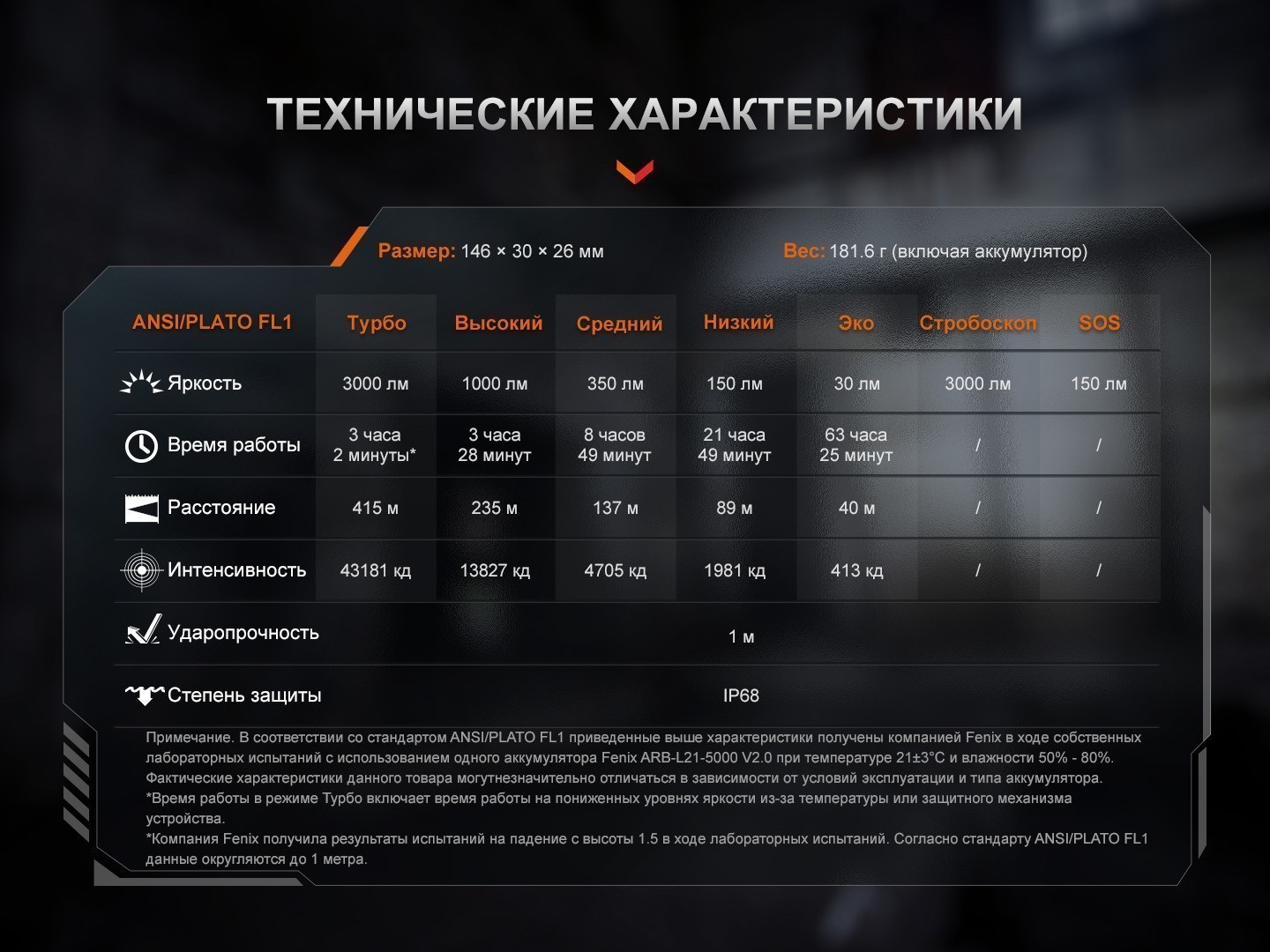 - Турбо — 3000 лм — 3 ч 3 мин — 415 м — 43 181 кд