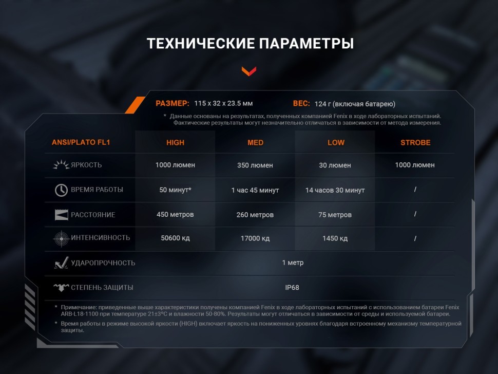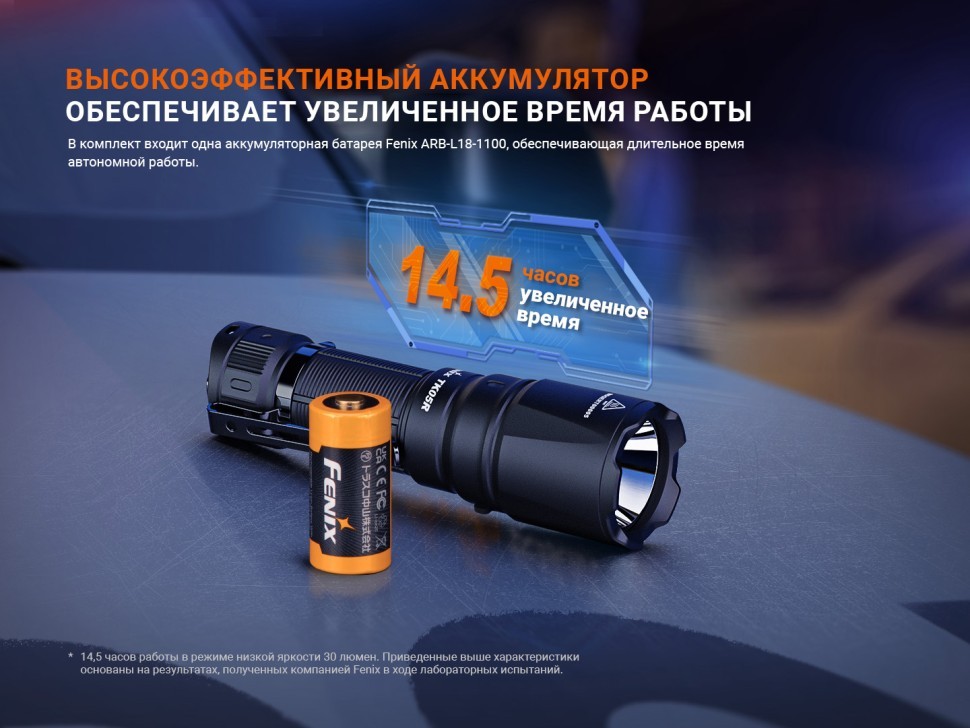 • питается от перезаряжаемого аккумулятора Fenix ARB-L18-1100 емкостью 1100 мАч;