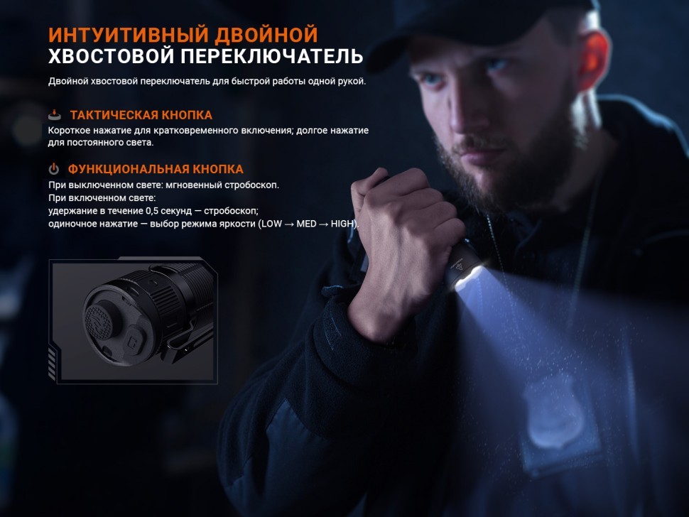 Fenix TK05R оснащен двойным хвостовым переключателем для быстрого управления одной рукой, что позволяет мгновенно переключать режимы яркости. Мгновенный фонарь со стробоскопом обеспечивает дополнительную защиту в экстренных ситуациях. Современный параболический отражатель обеспечивает концентрированный и сфокусированный луч. Фонарь идеально подходит для специалистов, которые ищут надежный инструмент для решения профессиональных задач.