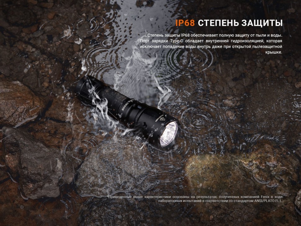 Питание осуществляется от одного перезаряжаемого аккумулятора Fenix ARB-L18-1100 емкостью 1100 мАч. Встроенный водонепроницаемый порт зарядки USB Type-C позволяет быстро и безопасно заряжать аккумулятор даже в неблагоприятную погоду.