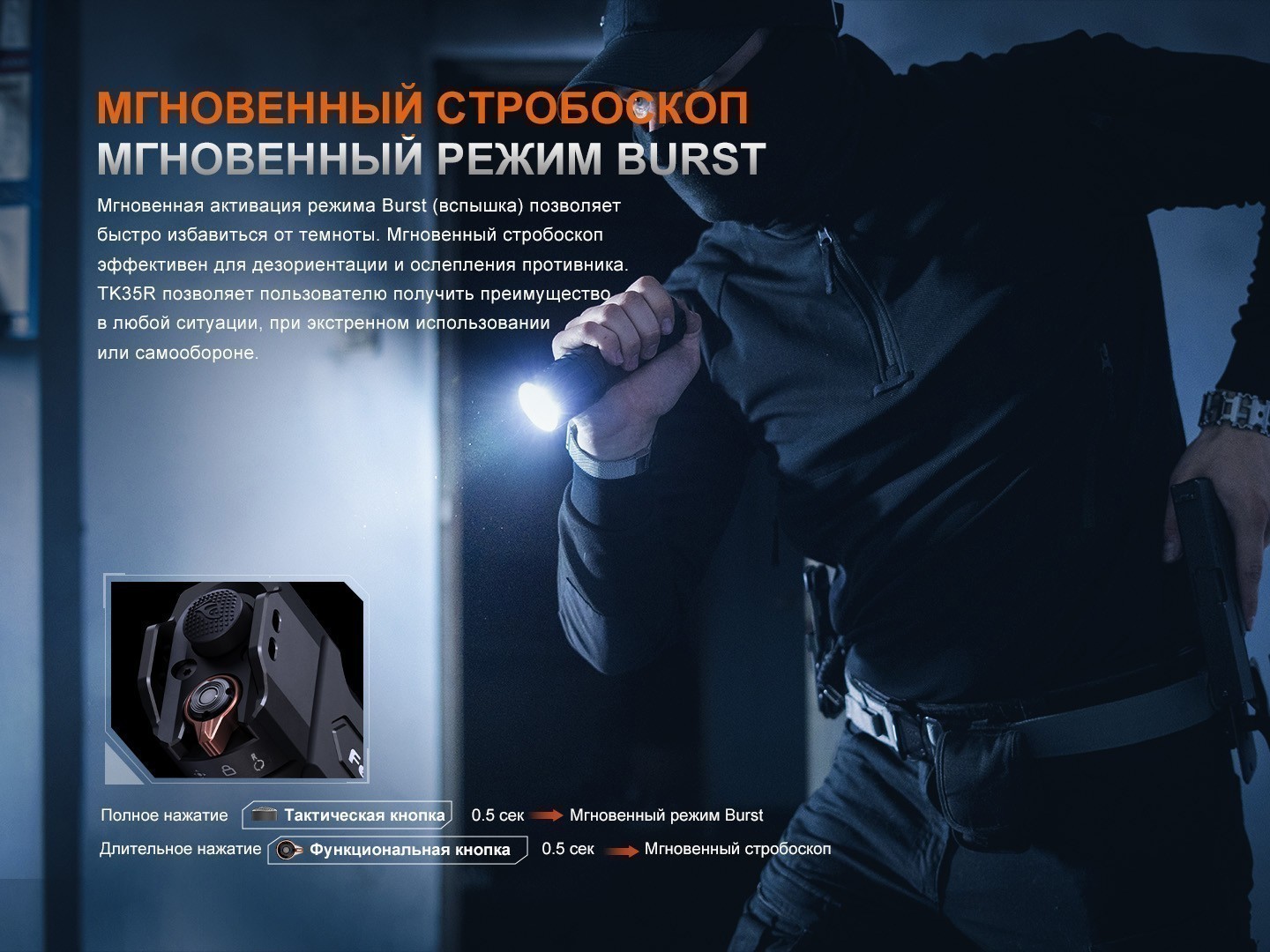 При длительном нажатии на тактическую кнопку активируется мгновенный Burst, а при удержании функциональной — стробоскоп. Встроенный индикатор заряда помогает всегда контролировать уровень батареи.