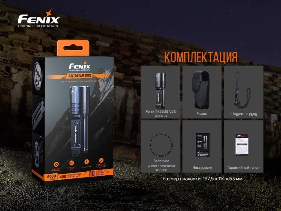Модель фонаря Fenix TK35UE V2.0, чехол, темляк, запасное уплотнительное кольцо, руководство к применению, талон гарантии.
