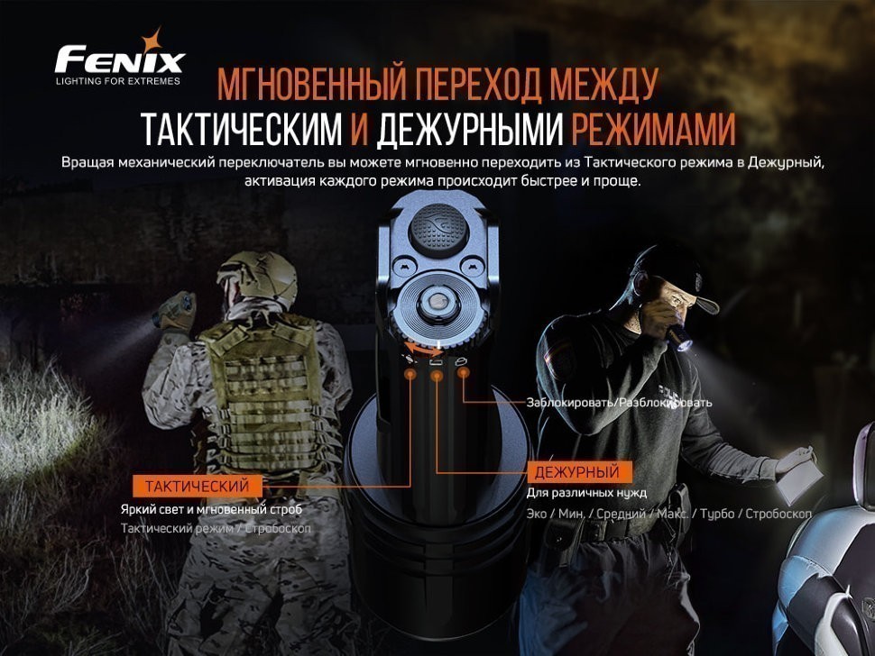Мгновенный строб, возможность блокировки, плоский корпус и двойные хвостовые кнопки — всё это делает модель способной удовлетворять потребности военных и правоохранительных органов. Также он может пригодиться многим любителям активного отдыха. Здесь предусмотрена опция определения уровня заряда аккумуляторов и оповещение о низком напряжении. Ниже – более подробно об особенностях и возможностях тактического фонаря.