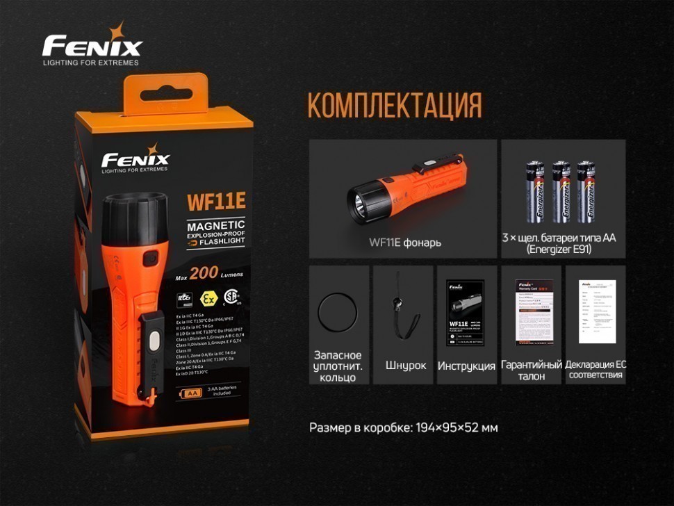 | Комплектация | Фонарь Fenix WF11E, 3 × батарейки AA Alkaline (Energizer E91), запасное уплотнительное кольцо, ремешок, инструкция, гарантийный талон. | ||||||