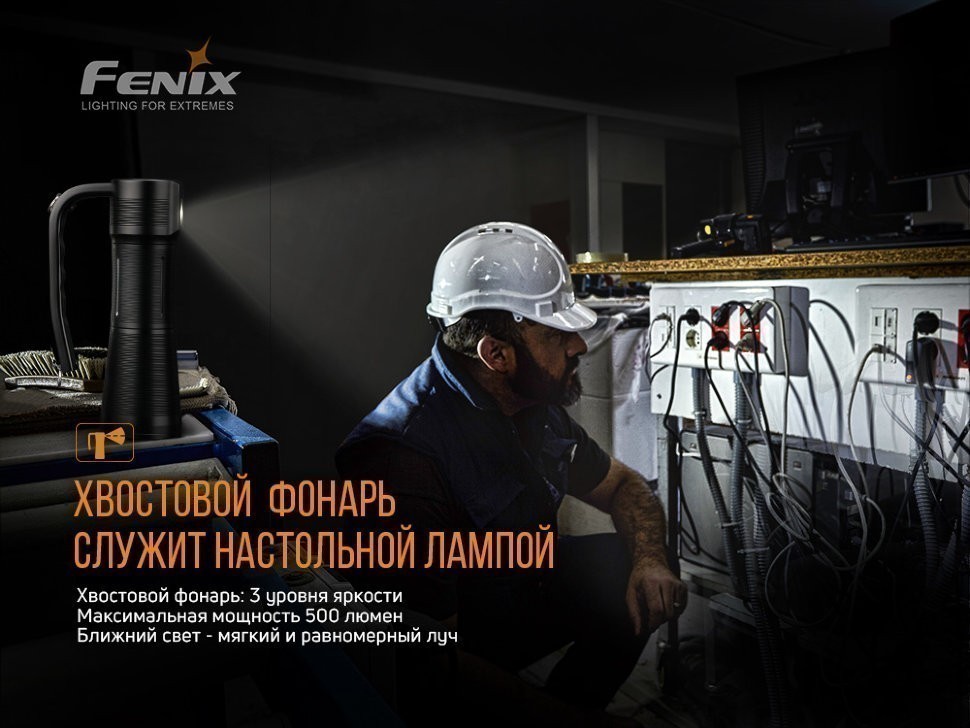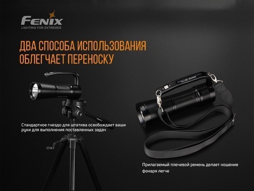 В наборе э фонарем продается ремень, чтобы его можно было носить на плече. Это полезный аксессуар, который упростит длительную работу с данном моделью. Ведь Fenix WT50R с учетом аккумулятора весит 742 г. Длина его корпуса составляет 200,8 мм, ширина 65 мм, а высота – 108,7 мм. Также фонарь можно поставить на стол в виде лампы, во время использования режимов диода в хвостовой части, закрепить на штативе-треноге.