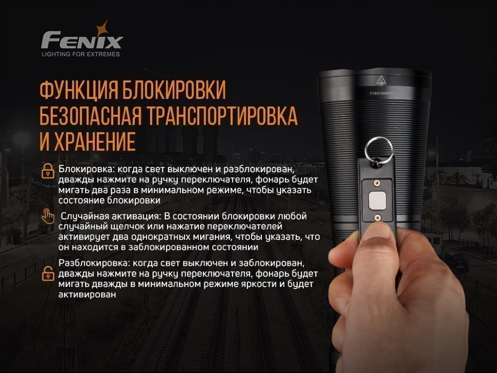Инструкции по использованию: Фонарь Fenix WT50R может быть заблокирован. Для этого нужно дважды нажать на кнопку на его ручке в то время, когда свет выключен. Мигание в режиме минимальной яркости укажет на активацию блокировки. Еще одно такое же действие деактивирует блокировку.