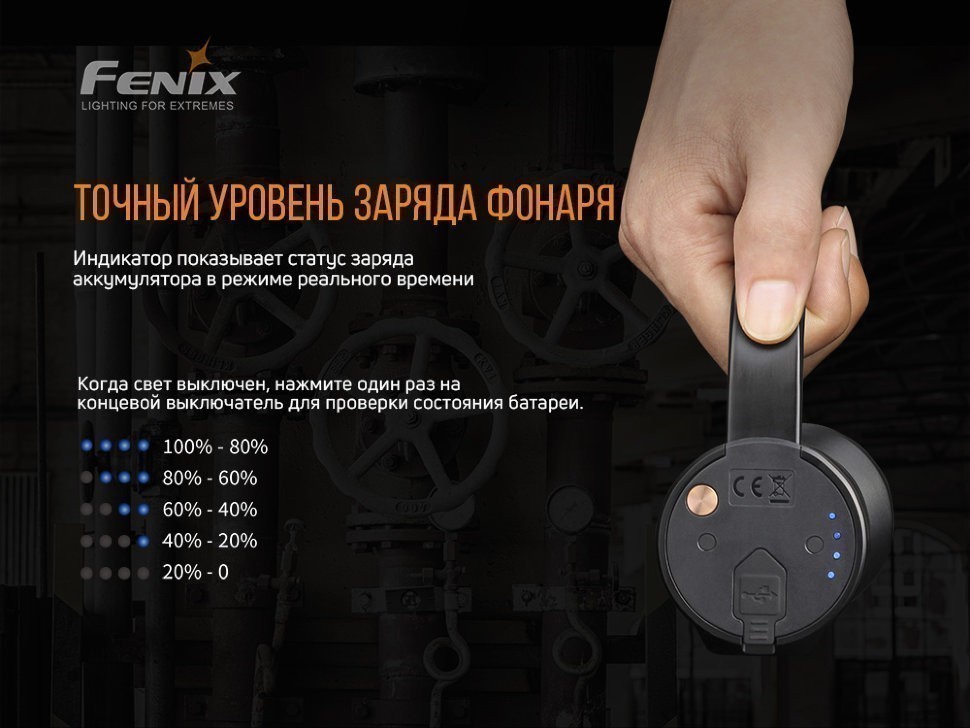 Fenix WT50R работает с собственным литий-ионным перезаряжаемым аккумулятором. Это элемент питания фирменного производства Fenix, рассчитанный на 5200 мАч емкости. Через стандартный кабель 5В/3А он полностью заряжается за 4,5 ч. Единственный доступный во время зарядки режим работы фонаря – это Low встроенного в хвосте диода. Также можно использовать фонарь как мобильный источник энергии и подключать его в другим устройствам, например, смартфону, для их зарядки.