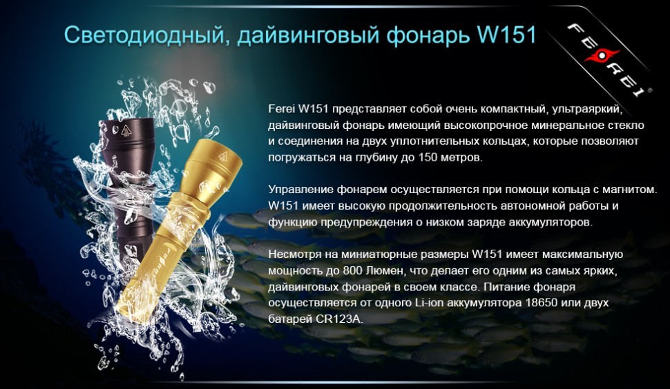 Компактный фонарь для дайвинга W151 от торговой марки Ferei. В модели используется современный светодиод Cree XM-L, который имеет холодное свечение, и обеспечивает световой поток 800 люмен. Свечение холодного оттенка позволяет использовать подводный фонарь W151 в замутненной воде. Модель имеет четыре уровня яркости, время работы в максимальном режиме 800 люмен составляет 1,5 часа. Двойное уплотнение резиновыми кольцами, обеспечивает надежную защиту от проникновения воды, которая позволяет фонарю без сбоев работать на глубинах до 150 метров. Цифровая регулировка уровня яркости, состоящая из повышающего драйвера и специализированного контроллера, автоматически поддерживает стабильное свечение светодиода. Удобный вращающийся магнитный переключатель на герконе обеспечивает надежную работу фонаря на любой глубине.
