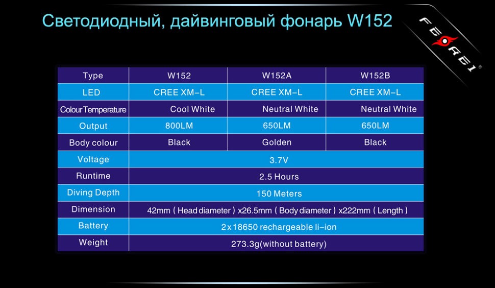 Качественный компактный фонарь для дайвинга W152B от бренда Ferei. В модели используется светодиод Cree XM-L, который имеет теплое свечение, подходящее для использования в прозрачной воде, и обеспечивающий световой поток 650 люмен. Модель имеет четыре уровня яркости, время работы в максимальном режиме 650 люмен составляет 2,5 часа. Для обеспечения надежной защиты от проникновения воды в модели используется двойное уплотнение резиновыми кольцами, которое позволяет фонарю без проблем работать на глубинах до 150 метров. Специально разработанное термозакаленное стекло выдерживает высокое давление воды на большой глубине. Фонарь имеет цифровую регулировку яркости – по мере уменьшения заряда элементов питания повышающий драйвер и контроллер автоматически поддерживают стабильную яркость свечения светодиода. Система индикации сигнализирует о низком заряде батареи и состоянии источников питания. Современный вращающийся магнитный переключатель на герконе обеспечивает надежную работу фонаря на любой глубине.