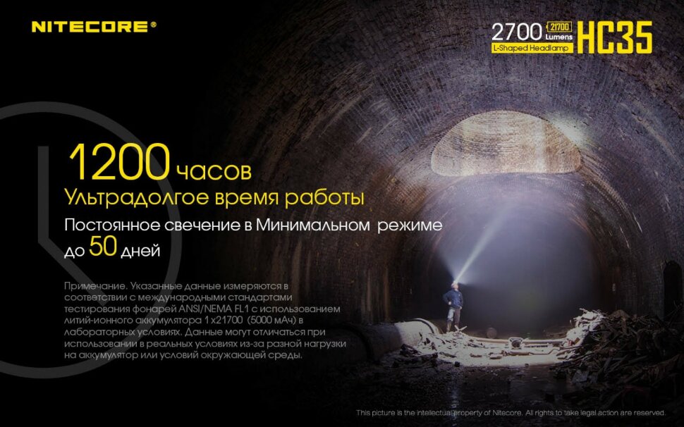 Встроенный аккумулятор нового поколения 21700 позволяет НС35 работать до 1200 часов - это 50 дней (при использовании самого низкого режима).