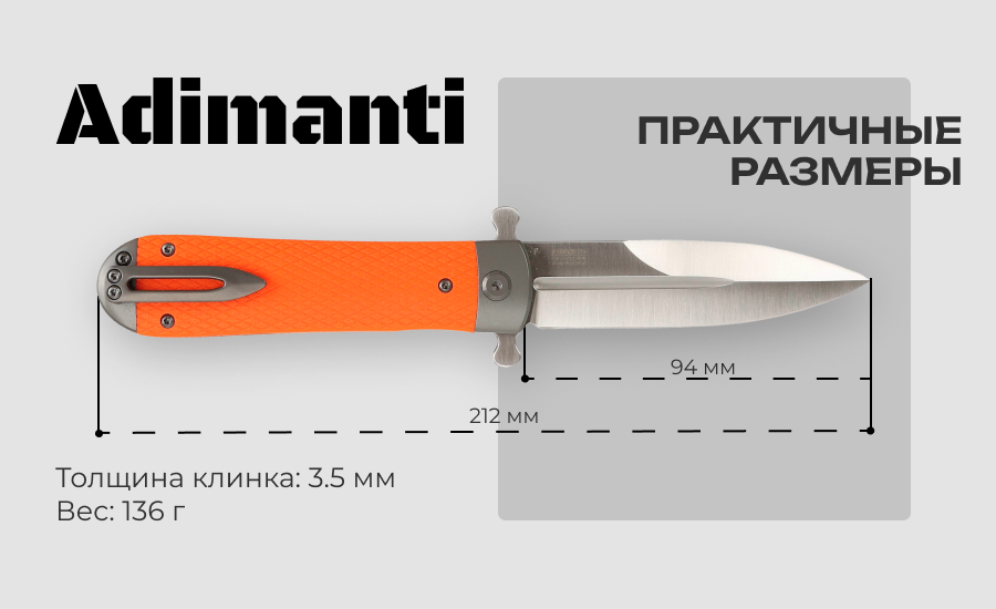 При длине в открытом положении в 212 миллиметров нож Adimanti Samson складывается в два раза и помещается в небольшой ладони. Вес модели составляет 163 грамма и для комфортного ношения производитель оснастил ее съемной клипсой укороченной длины, которая дополняет необычный дизайн инструмента.