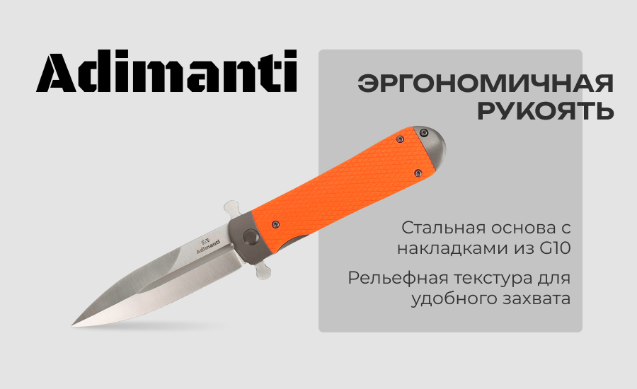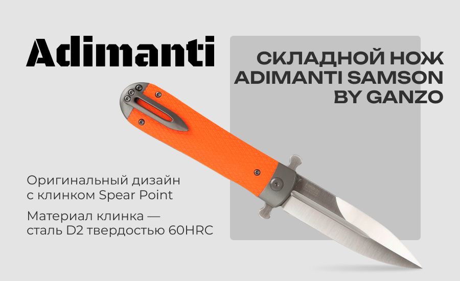 Нож Adimanti Samson имеет визуальное сходство с копьем благодаря симметричному клинку. Изделие рассчитано на использование как в городских, так и полевых условиях, поскольку оно имеет компактные габариты для комфортного ношения в кармане и обладает высокой стойкостью к воздействию агрессивных сред, в особенности ряда кислот и обычной влаги.