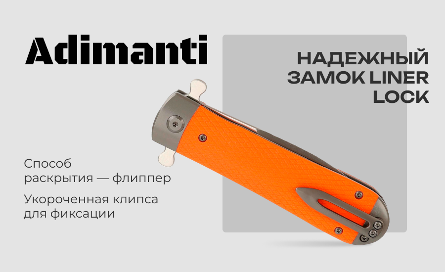 Нож Adimanti by Ganzo Samson – это компактный флиппер, чей клинок надежно запирается в открытом и закрытом положениях. Рукоять инструмента имеет стальную основу с двумя текстурированными накладками из G10 – прочного стеклотекстолита, который высоко ценится за свою стойкость к ударам и механическим повреждениям. В отличие от дешевого пластика, на стеклотекстолите не образовываются микротрещины после продолжительного воздействия низких температур. Материал также не деформируется в случае долгого нахождения под прямыми лучами солнца, не выцветает и не скользит в ладони.